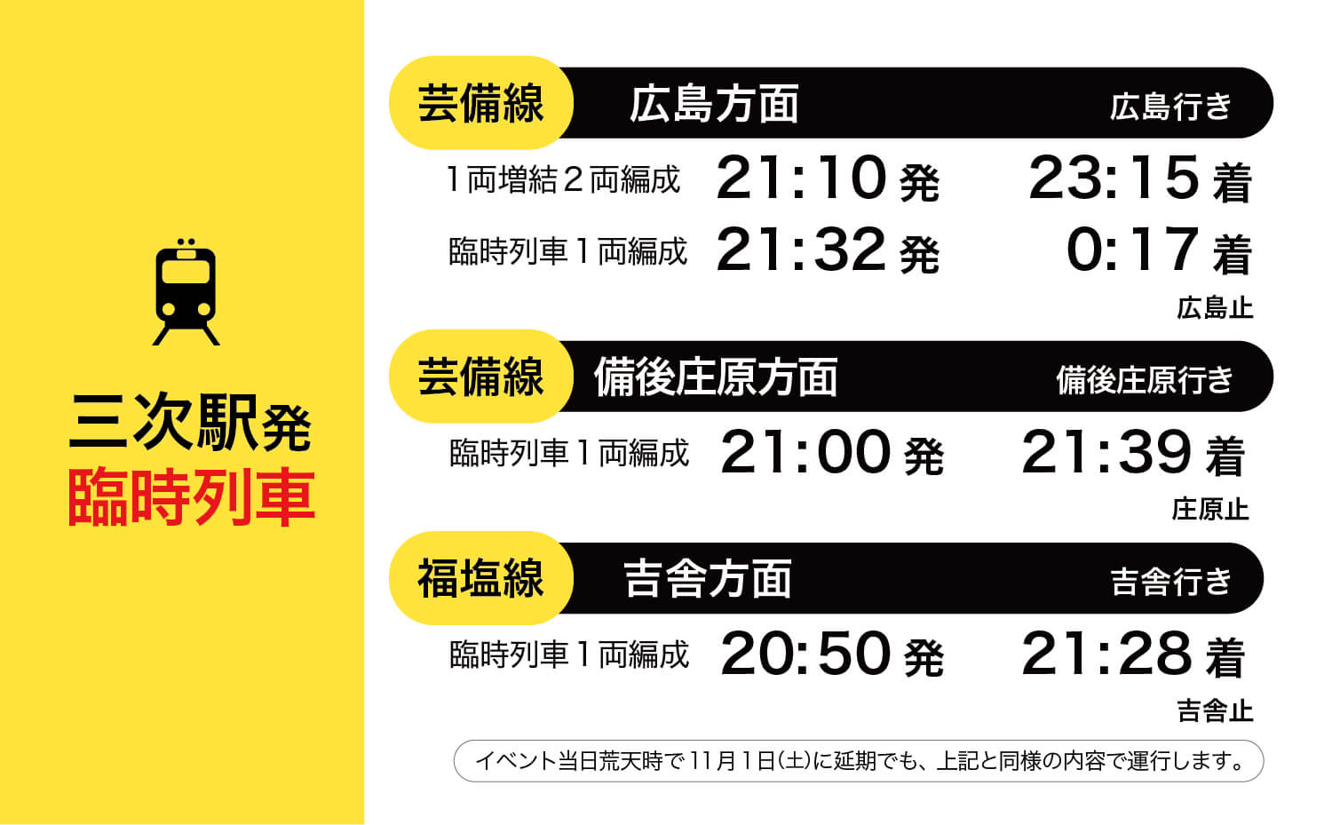 みよし市民花火まつりまで あと、 00日 00時間 00分 00秒 今年のテーマは、 本年は、尾関山公園開園100周年という佳節の年であり、今回初の試みとして、花火の内容について市内高校生の皆様にも企画から参加していただきます。花火を鑑賞いただき、みんな笑顔を輝かせ前に進める様なプログラムになっております。 駐車場情報PARKING 十日市親水公園メイングランド・野球場ほか・三次中学校グランド・三次市民ホールきりり・きりりパーク(五龍池貯留施設)・広島県三次庁舎(北部事務所)職員駐車場・稲荷町グランド(少年野球場・サッカー場)・みよしまちづくりセンター駐車場(16時以降駐車可) 駐車場情報 三次市駐車場混雑表示サービスをご利用ください。駐車場の混雑状況が確認できます。 周辺マップ 観覧エリア、車両帰路ルートなど。路上駐車、民地への無断駐車はしないでください。 臨時列車情報SPECIAL TRAIN 臨時列車 花火まつり当日、JR三次駅より芸備線および福塩線の各方面へ臨時列車が運行します。 トイレ情報TOILET ぜひ三次市公式LINEを友だち登録してみよう!市政情報や緊急情報、イベント情報など暮らしに役立つ情報があなたに届きます! トイレ情報 会場周辺のトイレ(仮設トイレを含む)が三次市公式LINEで検索できます!ご活用ください。※仮設トイレの場所は目安としてご利用ください。 三次市公式LINE友だち登録はこちら プログラムPROGRAM 協賛様一覧SUPPORTER 本年も三次市内外からたくさんのご協賛をいただきました。企業スポンサーの皆さま、ご支援くださった事業所、協賛者の皆さまに心より感謝いたします。 本年も三次市内外からたくさんのご協賛をいただきました。企業スポンサーの皆さま、ご支援くださった事業所、協賛者の皆さまに心より感謝いたします。 お願い 公式駐車場の開場は当日14:00です。 当日14時まで駐車できません。公式駐車場の数には限りがあり、幹線道路も深夜まで混雑することが予想されます。各種公共交通機関をご利用、または可能な限り乗合せでのご来場をお願いします。 前日からの場所取りは禁止です。 前日に場所取りされた場合には、実行委員会でシート等を撤去させていただきます。 当日のドローン・ラジコン機等の飛行は禁止です。 当日のドローン・ラジコン機等の飛行は禁止です。 ゴミのお持ち帰り運動にご協力ください。 ゴミのお持ち帰り運動にご協力ください。